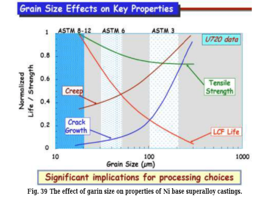 晶粒尺寸的增加以及浇铸温度的增加。发现晶粒尺寸稍大受接种量(CoO.Al2O3)变化的影响。图39和40说明了谷物的影响尺寸对镍基高温合金铸件性能的影响。