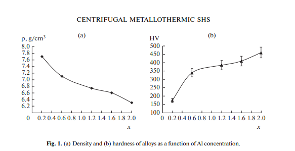 [30–33]的作者先前指出,重力作用有利于将燃烧产物分离成两层(目标产物锭和Al2O3炉渣)以及所有组分的对流混合,这对增加燃烧量尤为重要。合金中成分的数量和浓度。因此,HEA的合成是在离心式SHS机器中进行的[30]。