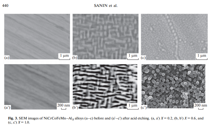 对所获得的合金的结构成分的分析表明,这些HEA由两相组成:基于γ/α-Fe的固溶体和基于β相的固溶体(NiAl金属间化合物)。