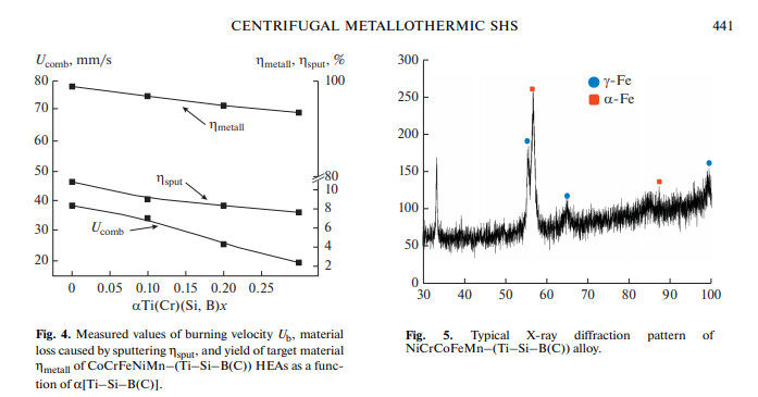在将离心加速度在20–70 g范围内变化的实验中,找到了用于合成该系统合金的较佳范围65±5g。 α值的增加(与以前的研究相比)是由组合物中存在的难熔组分(例如硼化物和硅化物)所解释的。