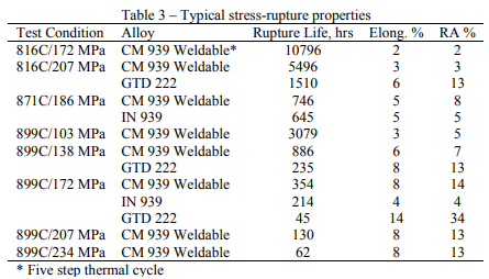 cm939可焊合金的典型拉伸性能如表2所示;典型的应力-破裂特性见表3和图6。标准IN 939[13]和GTD 222[14]合金的性能比较。GTD 222合金(表1[15)是通用电气公司开发的一种替代合金,通常用于类似于in939合金的应用。与标准in939合金相比,GTD 222具有更好的延展性,但强度较低。