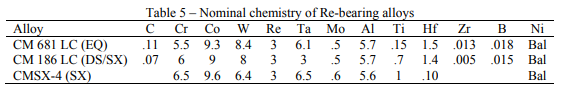 合金发展的下一个重大进展是将铼(Re)引入EQ。DS和SX allovs(表5)。这些所谓的“第二代”合金具有显著的蠕变断裂性能,这是由于Re分散到y基体,延缓了y(强化)相的粗化,并增加了yly' misfit[201]。稀土“团簇”作为位错运动的障碍,从而提高了合金的强度。